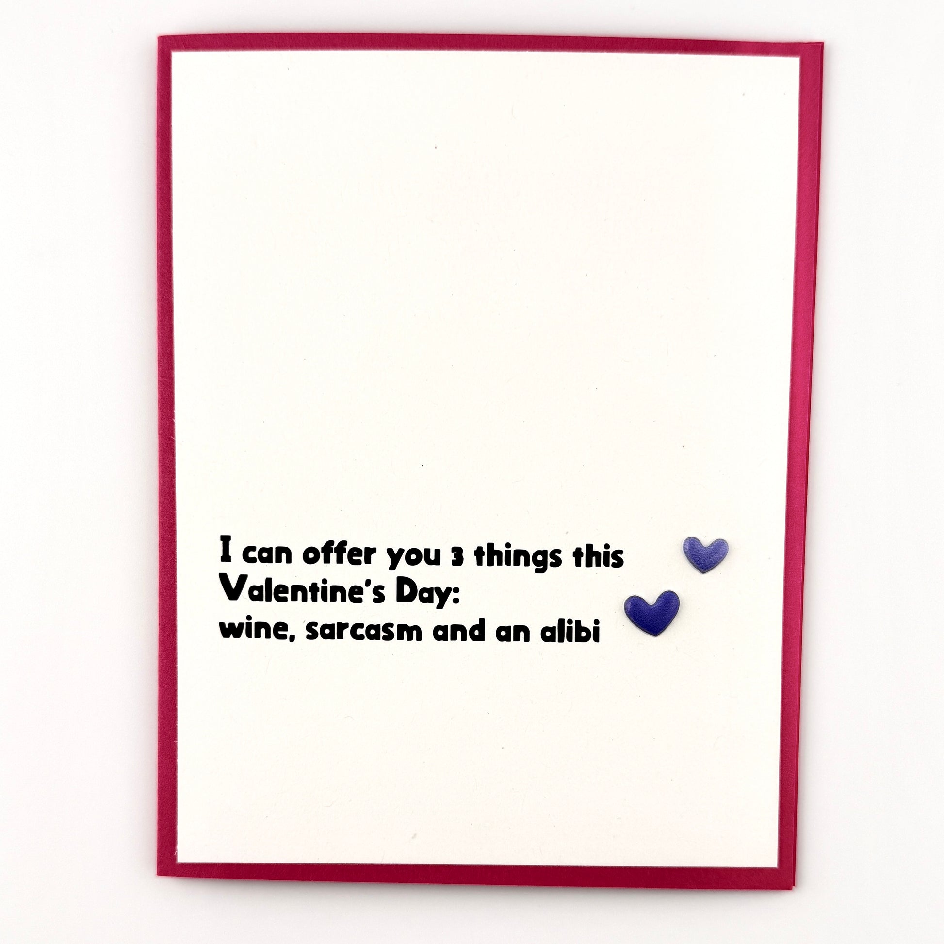 Valentine Offer 3 Things Wine, Sarcasm, Alibi card
